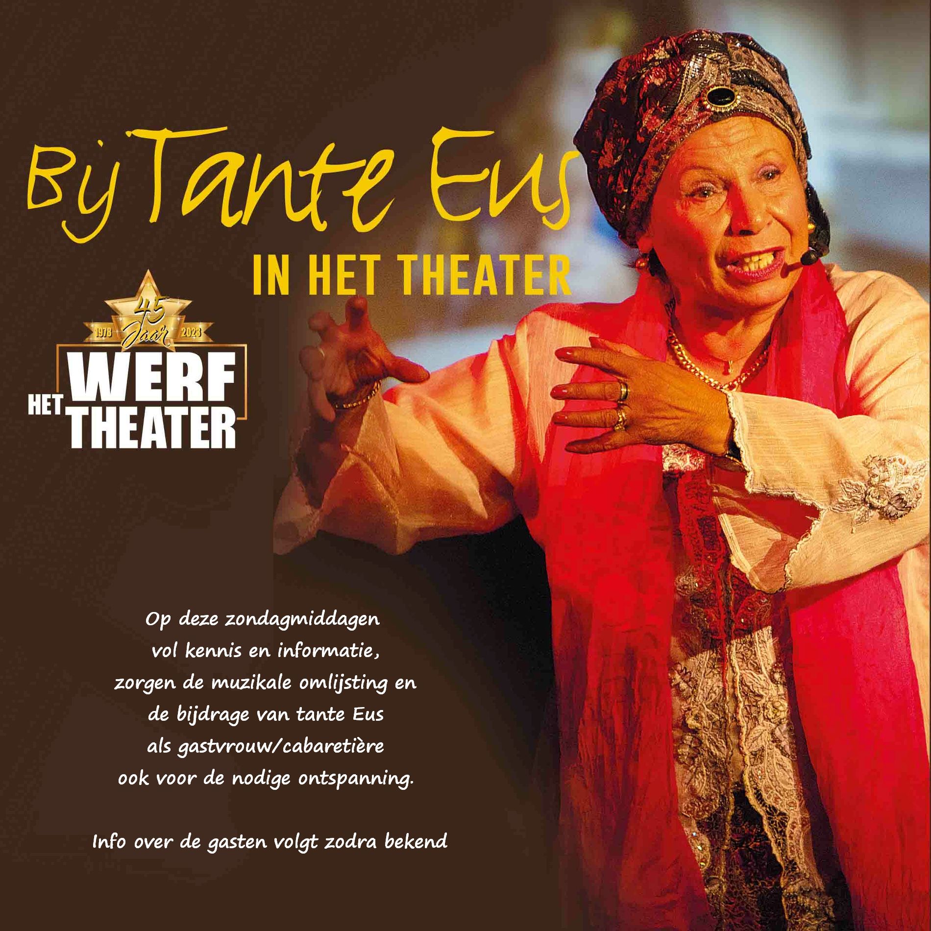 Op deze zondagmiddagen vol kennis en informatie, zorgen de muzikale omlijsting en de bijdrage van tante Eus als gastvrouw/cabaretière ook voor de nodige ontspanning.